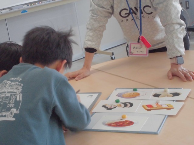 →3つのヒントで、答えに導くクイズを考える活動です。食べ物や動物などの中から1つ選んで、色や形や種類などのヒントを考えます。ヒントは3つなので、3つ目のヒントで答えに辿り着けるように、伝える順番や難易度などを考える様子が見られます。