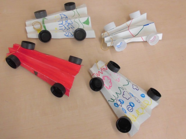 →週ごとにいろいろな工作を行います。「電池を使って転がるおもちゃ」や「ゴムを使って動く車」や「落として遊ぶおもちゃ」を作りました。工程に沿って、折る・切る・貼るなど手先を使った作業にそれぞれ取り組みました。完成して試す際には、狙い通りに動かすにはどうすればよいか、自分なりに考えたり、友達のよさを参考にしたりして挑戦する姿が見えました。