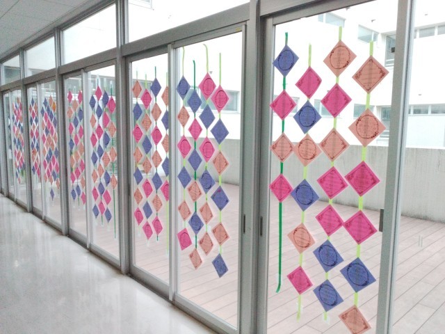 6年生の廊下の窓に1年生から5年生からのメッセージが飾られています。