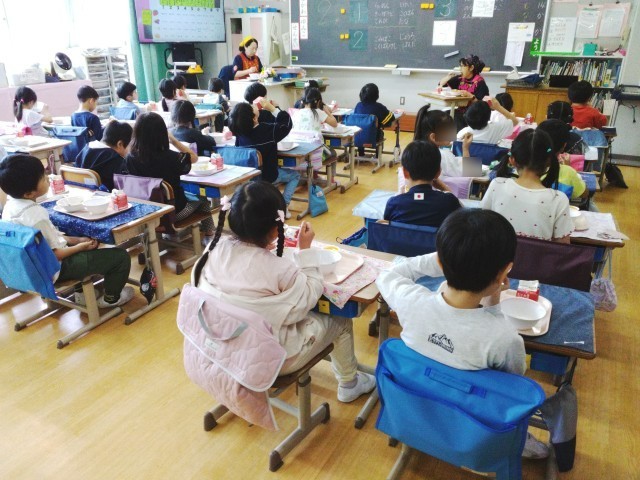 少し早めに給食当番の児童は準備し、先生の援助のもと配膳等を行いました。