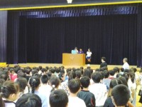 さすが6年生はとても素早く行動しています。1年生は初めての訓練でした。訓練後に机の脚を持つ場所など練習しました。