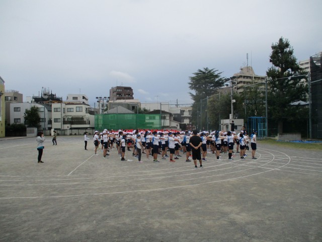 10月15日(水)1校時に、スポーツフェスティバルに向けての全校練習をしました。開会式の並び方や基本的な動作(気をつけ・前へならえ・休め)の確認と、準備運動、応援合戦の練習をしました。