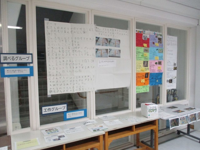 ほうなん冬灯り開催期間中、3年生の子供たちが、総合的な学習の時間「むさし野の森プロジェクト」で調べたこと、むさし野の森の木の枝や葉でつくった物等を、玄関に展示しました。