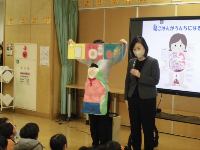 3時間目の学習は、学年全体で「子どもイキイキ食育チーム」による「バナナうんちで元気な子!~生活リズムを整えよう~」の講義を聞きました。