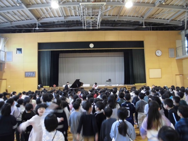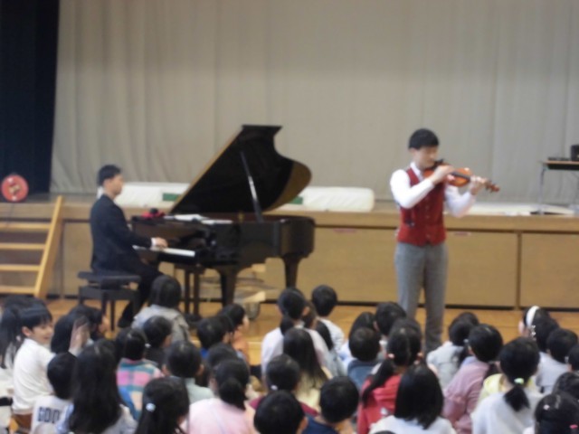 1月26日(月)2時間目、昨年11月に予定されていて延期になったEverly(エバリー)のミニコンサートがありました。ヴァイオリンとピアノという2つの楽器だけでしたが、クラシックからディズニーソングまで、とても素敵なコンサートになりました。曲に合わせて一緒に体を動かす体験もして、楽しい時間を過ごしました。音楽は、心が明るくなります。これからも、音楽に親しみ、楽器に触れる機会が増えるといいなと思います。