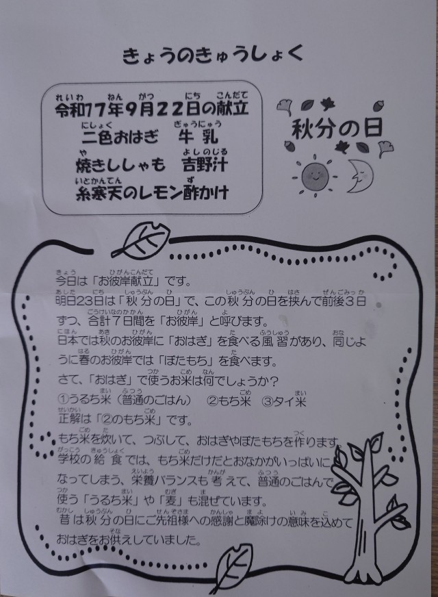 お彼岸献立 公開日 2025/09/23 更新日 2025/09/23 校長室より 今日は「お彼岸献立」です。二色おはぎがとてもおいしい。まだまだ暑い日が続きますが、給食では秋を満喫しています。 いじめ防止基本方針 学校だより 給食献立表 全校 1年 2年 3年 4年 5年 6年 PTA WEB 校内見学