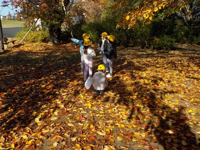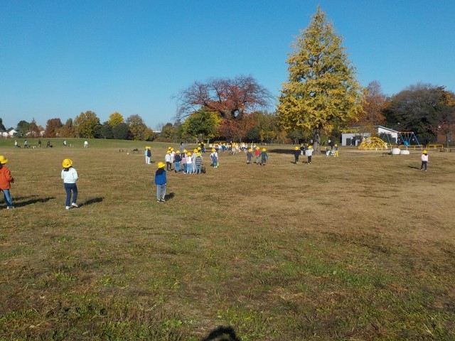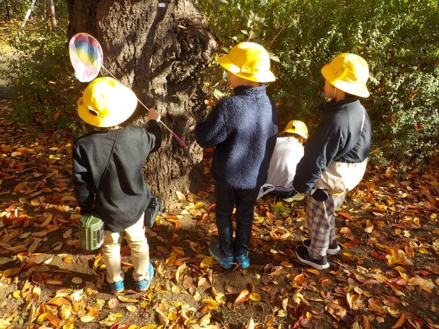 高井戸公園に行って秋さがしをしました。虫や落ち葉、松ぼっくりなどいろいろなものを見つけていました。振り返りでは、「虫があまりいなくなっている」「葉っぱがきれいな色になっている」など夏からの変化に気付くことができました。