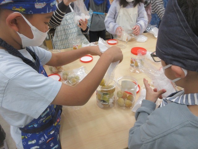 ボトルの中に梅の実と氷砂糖とを合わせ、10日ほど寝かせると、おいしい梅ジュースになります。日々楽しみに待つ2年生たちでした。
