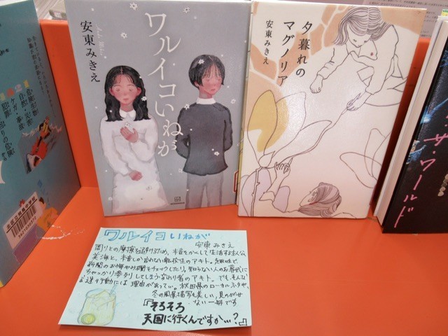 写真:3枚目、 「 安東みきえ 」 先生の作品が、ポップ付きで展示されていました。