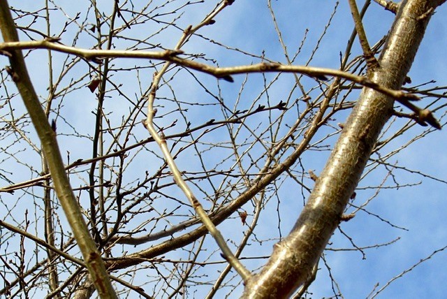 写真:4枚目、普段あまり目に留まらない正門横の桜の木も、芽吹きの準備を進めていました。