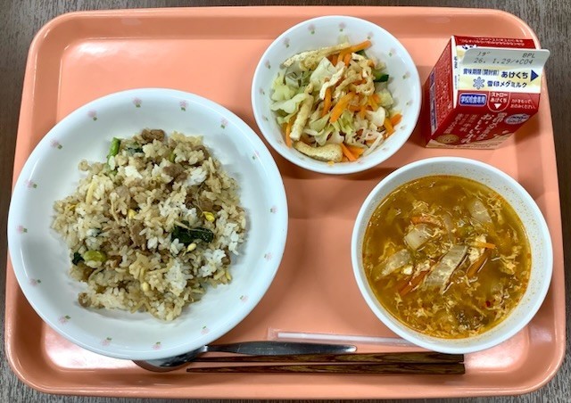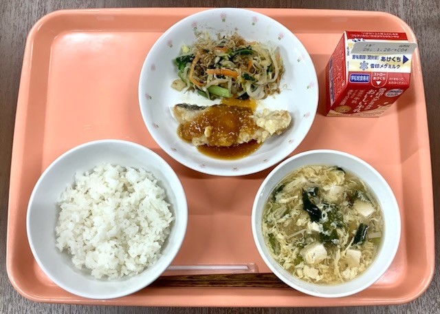 ご飯・豚肉と厚揚げのオイスター炒め・せん切り野菜のスープ・牛乳