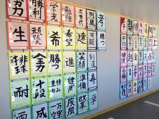 午前中の会議から戻り、校内を巡回していると、各学年のフロアに 「 書初め 」 が掲示されていました。