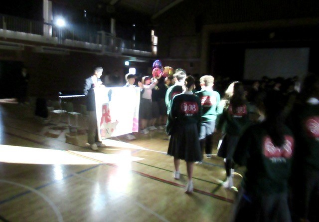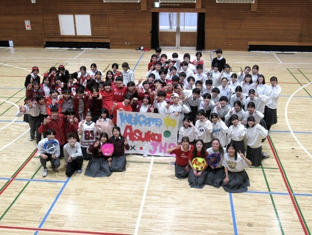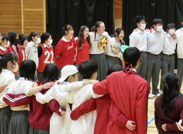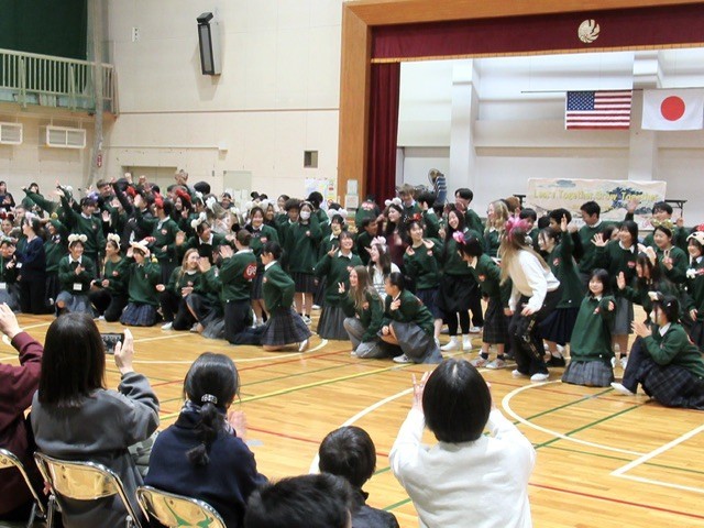 小学校の運動会を再現する企画では、赤組 ・ 白組の応援団長が登場。ユーモアあふれる掛け声で盛り上げていました。その後、SHSの生徒も一緒に 「 玉入れ 」 を楽しんでいました。写真 : 5 ・ 6枚目、円陣を組んで、肩を組み、セブンヒルズスクールの 「 スクールソング ( 校歌のようなもの ) 」 を全員で歌います。写真 : 7 ・ 8枚目、今日の1日体験の写真を貼った色紙にコメントを加え、お別れのセレモニーも。写真 : 9枚目、最後に、全員で集合写真を撮影し、素敵な時間を終えました。放課後、引率の先生と ( 通訳の方を交えて ) お話をしましたが、 「 素晴らしい生徒たち、学校ですね。 」 と、 「 今日のレクリエーションは、生徒たちが企画 ・ 運営しているのですよ。 」 に 「 みんな一生懸命で明るい生徒たちですね。 」 と。「 昨日は、どこか出かけられたのですか? 」 に、渋谷と原宿、明治神宮に行かれたとのこと。神社が 「 Beautiful 」 と繰り返し、おっしゃっていたのが印象的でした。2年生のみなさん、今日は1日SHS受け入れのため、いろいろとありがとうございました。写真:10枚目、 「 SHS交流実行委員 」 のみなさん、SHSの生徒そして、飛鳥中生にとって、とても素敵な1日になりました。お疲れ様。ホストファミリーとして受け入れていただいている保護者の皆様、あと2日よろしくお願いいたします。校長:高田勝喜 -