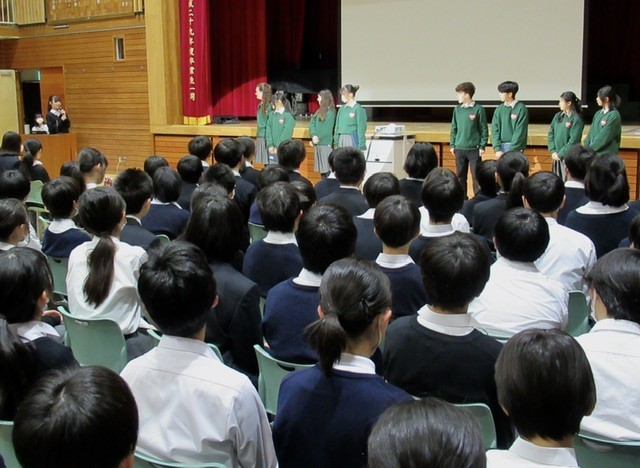 飛鳥中代表の4名の海外派遣生から 「 セブンヒルズスクール 」 で体験したことやホストファミリーと過ごした様子など、スライドを活用し報告してくれました。