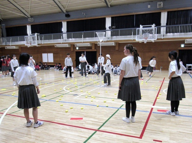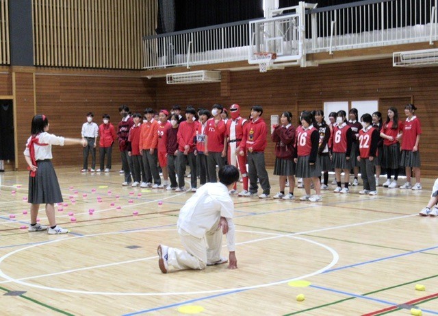 写真:4枚目、 「 ゴムボールを投げてみたい人? 」 に、手がたくさん挙がります。