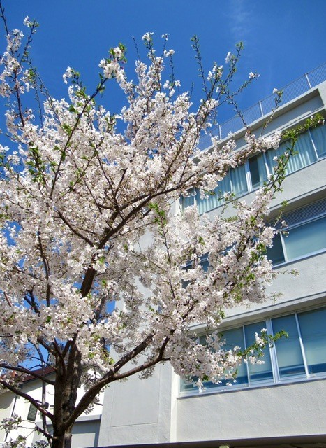 正門横の桜のピンクと空の青がとても印象的です。 まさに、「 お花見日和 」 といった感じです。