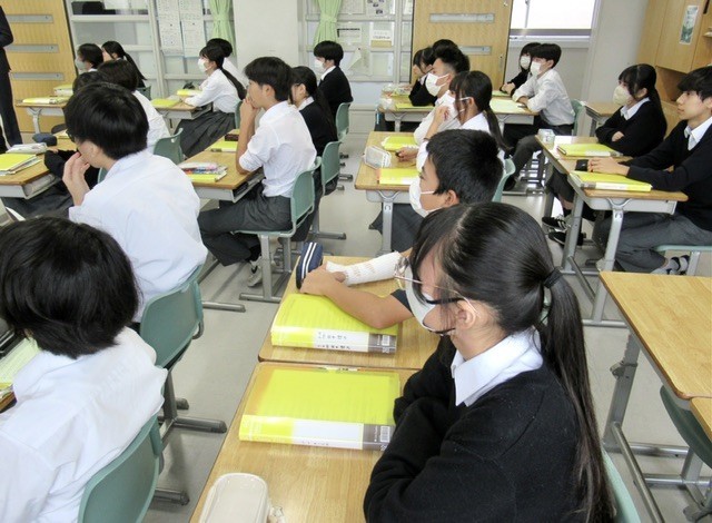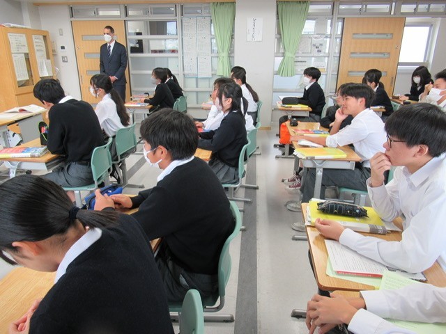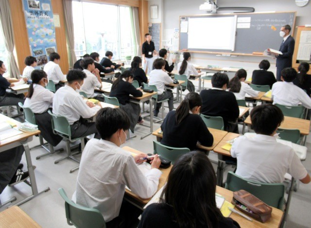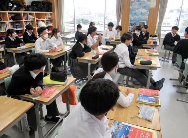 通常、英語の授業は少人数指導で行っていますが、現在、英語の先生が 「 海外交流事業 」 の引率をしているため、クラス単位で授業が行われています。