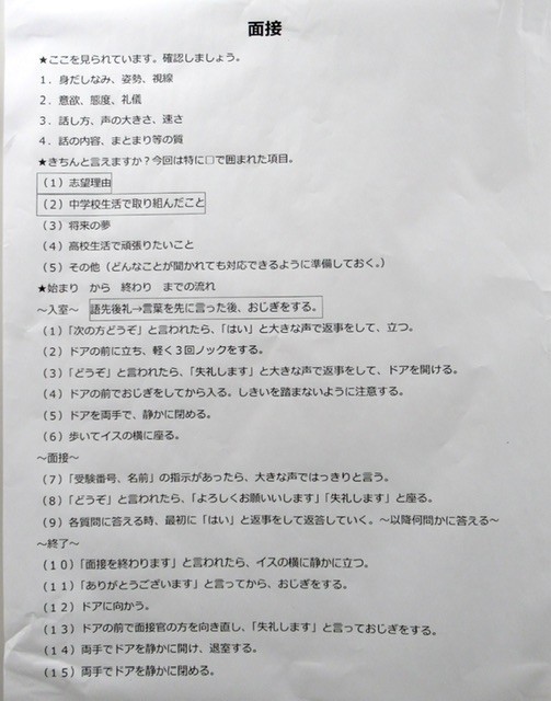 私立高校 ・ 都立高校の入試で 『 面接試験 』 がある生徒は、今後、私と副校長先生とで一人ずつ、面接試験の練習を行う予定です。