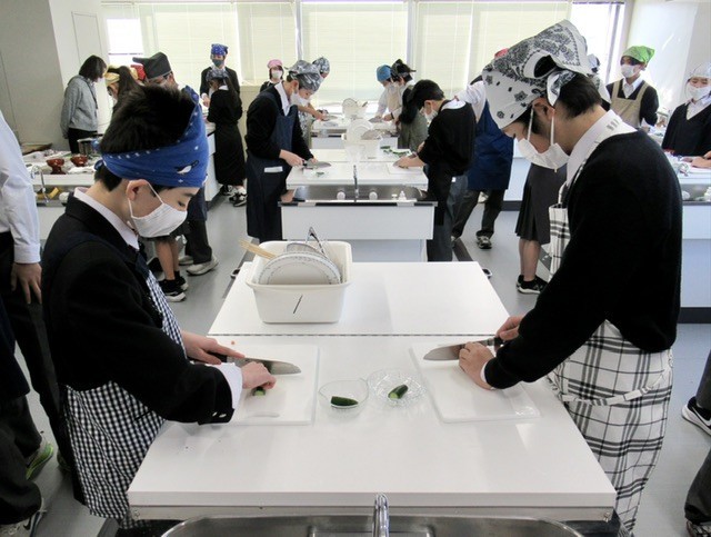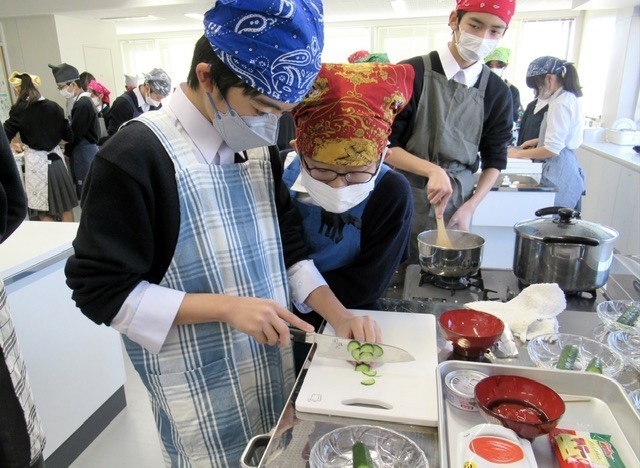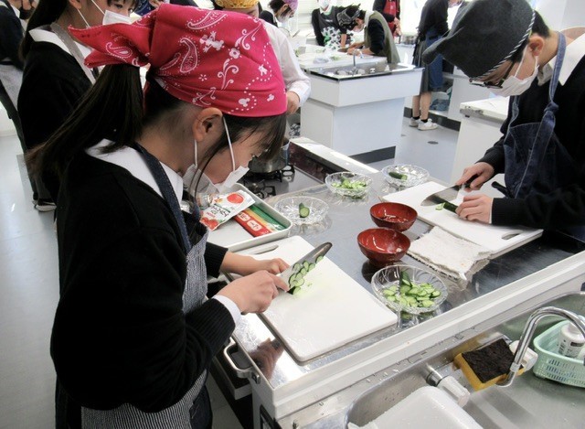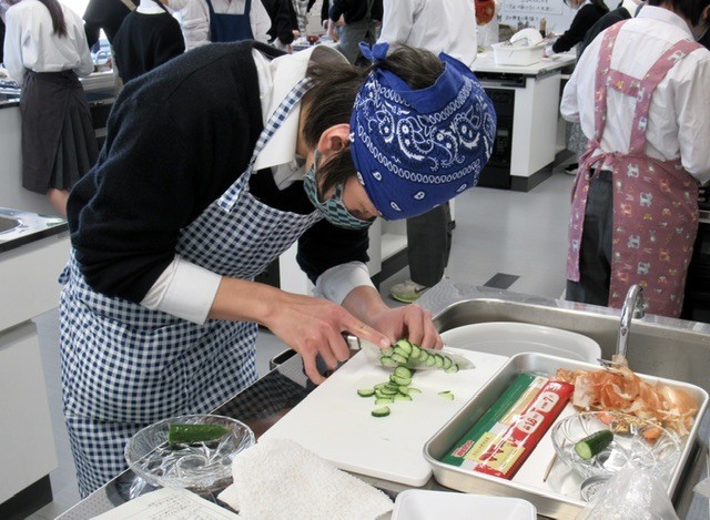 授業の中盤、 「 ツナサラダ 」 に入れる 「 きゅうり 」 を使って、包丁の使い方 『 薄切りのテスト 』 が行われました。