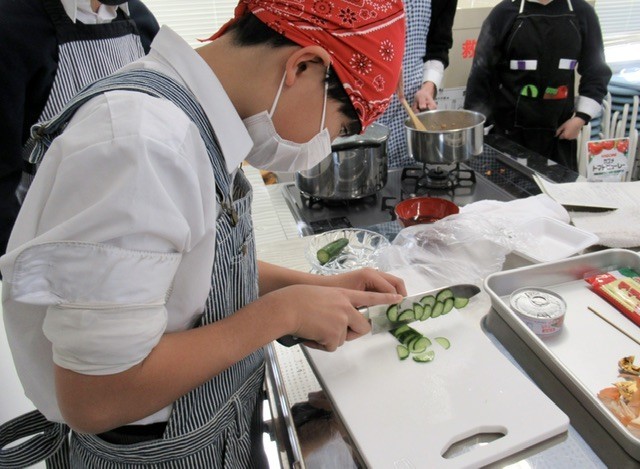 写真 : 10枚目、みんな上手に 「 きゅうりの薄切り 」 ができていました。