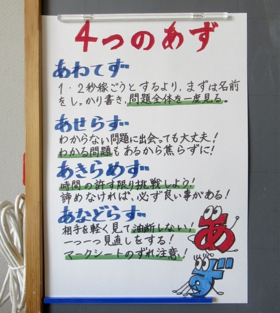 『 あわてず ・ あせらず ・ あきらめず ・ あなどらず 』 この「 4つの “ あ ” ・ “ ず ” 」 を心の中で唱え、これまで積み重ねてきたすべてを発揮してほしいと思います。
