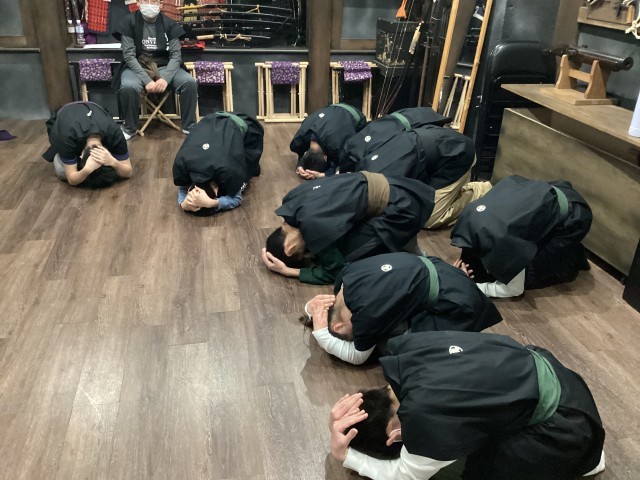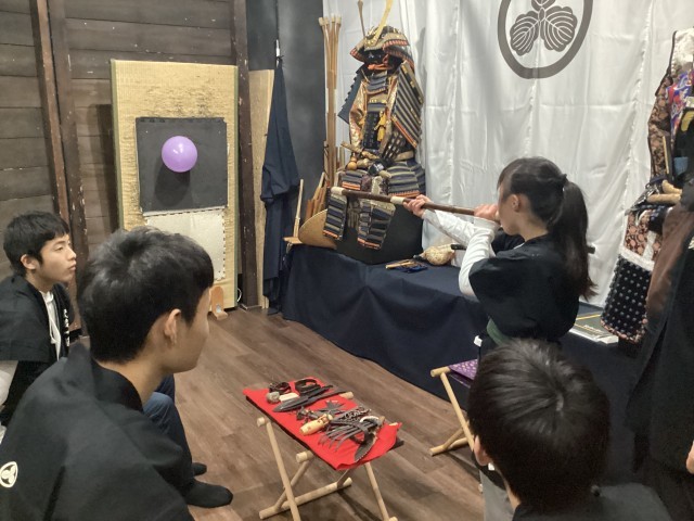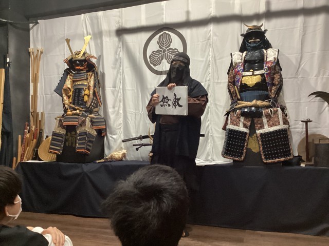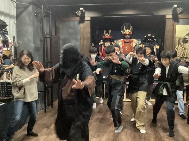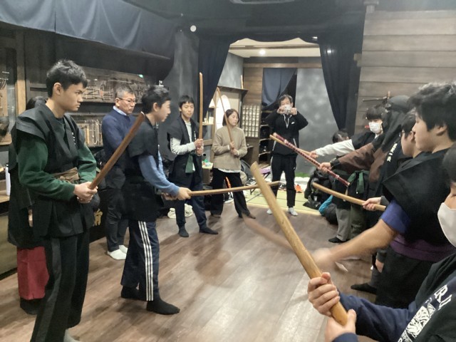 忍者について学び、その後は手裏剣や木刀を使った体験などを行いました。