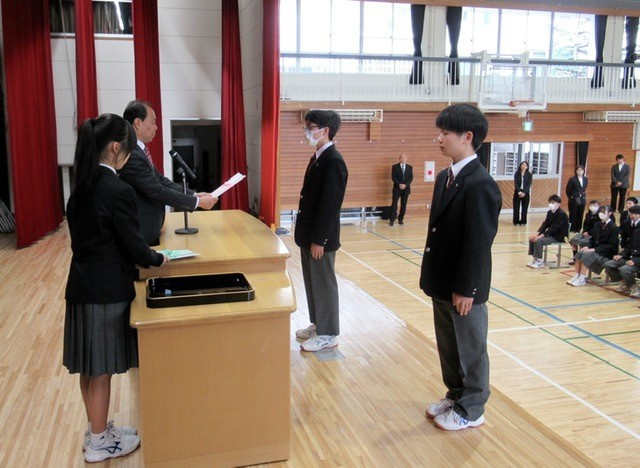 写真 : 2枚目、 1年生 ・ 2年生の代表生徒にそれぞれ 「 終了証 」 を渡しました。