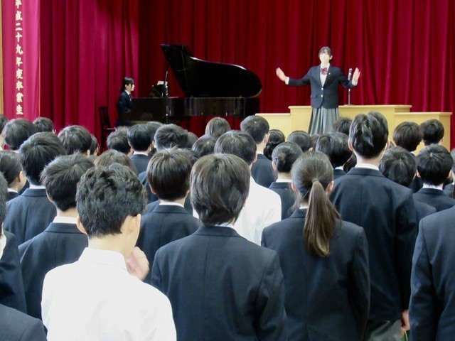 写真 : 3 ・ 4枚目、 「 校歌斉唱 」 の指揮者 ・ 伴奏者も卒業生からバトンを受け継ぎ、2年生が担いました。