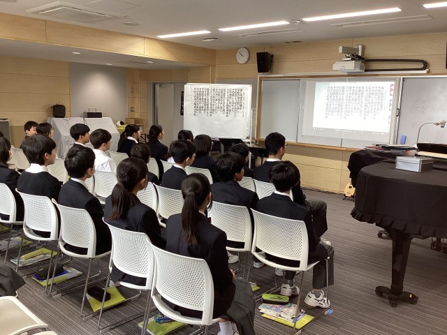 その後、早速、校歌の練習に取り組みました。飛鳥中の校歌は歴史あるものだけに、やや難しい言葉遣いもあり、生徒たちは少し苦戦している様子でした。