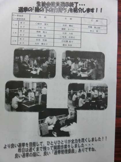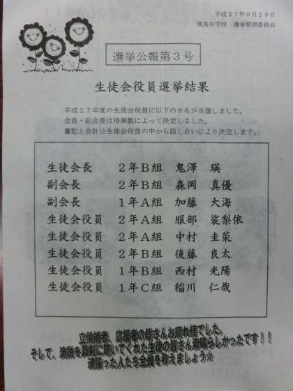 9月29日(火)生徒会役員選挙の結果 公開日 2015/10/02 更新日 2015/10/02 部活動・生徒会 9月29日(火)生徒会役員選挙の結果 新しい役員の皆さんに大いに期待します。おめでとうございました! ※選挙集計の様子が紹介されました。