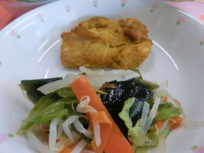 本日のメニューは、きのこご飯、わかめサラダ、野菜たっぷりスープ、そして今日はセレクトメニューで、鶏肉の(照り焼きまたはカレー焼き)素晴らしい!