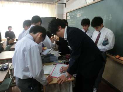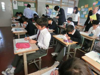 ※都内の数学科のスペシャリストの先生方が集合され、1年生の授業参観、授業内容・方法を研究されました。1年生は、大変熱心で、授業が終わっても、議論が続いていました。(指導は浅賀先生。指導・助言は東京都教職員研修センターの小宮教授)