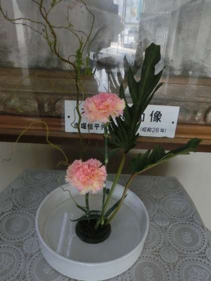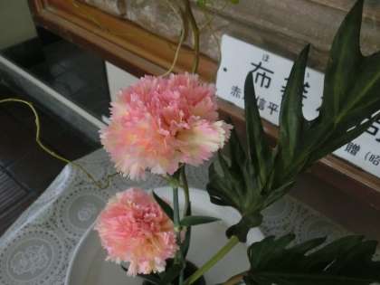 ※今回の花は、雲竜柳、カーネーション、セローム、ガク紫陽花、スカシ百合(ゆり)、クジャク草です。カーネーションのピンクが美しいですね!