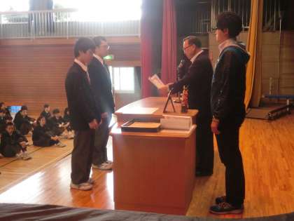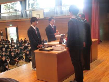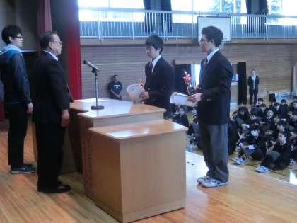 10月19日(月)朝礼 北区中学校秋季大会表彰 男子バスケットボール部準優勝!男子剣道部1学年個人の部優勝・準優勝!本当におめでとう!