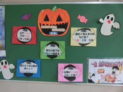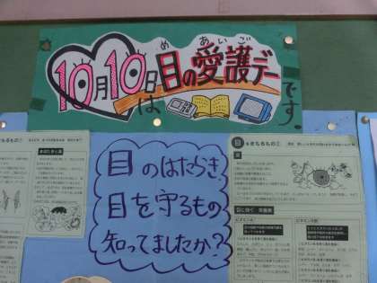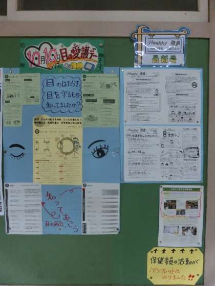 秋の夜長、読書をしましょう!スマホやゲームを1時間以上続けていると、立体視力低下が起きるという臨床データがあるようです!★保健室の前に、目の健康特集があります。見てください!