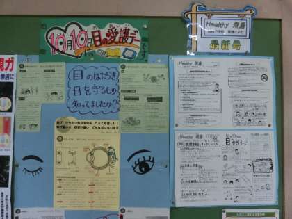 秋の夜長、読書をしましょう!スマホやゲームを1時間以上続けていると、立体視力低下が起きるという臨床データがあるようです!★保健室の前に、目の健康特集があります。見てください!ハロウィンの眼の問題クイズもあります!