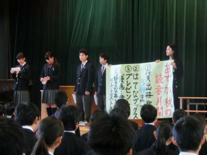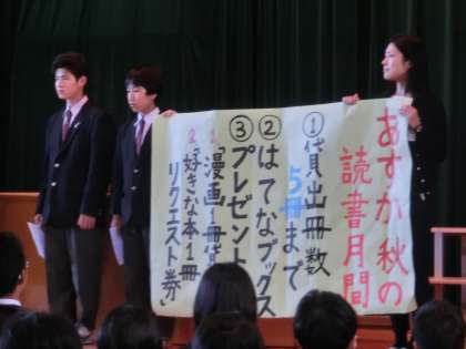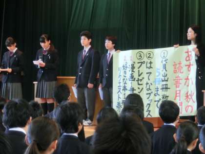 10月26日(月)朝礼 11月読書キャンペーン(飛鳥秋の読書月間)の説明がありました 杉山学校図書館指導員(学校司書)からも説明していただきました!