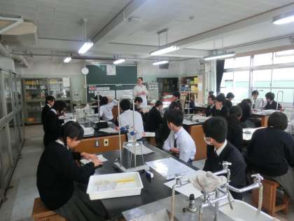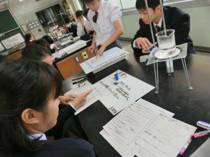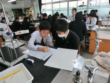 エタノールの沸点調査実験(1年)、電圧の直列と並列の式の解決(2年)と、難題でした。しかし、短い時間で、かなり問題把握ができ、解決にいたった生徒もいて、問題解決能力の伸長に驚きです。(指導は、理科の羽根田先生と小磯先生、指導助言は北区教育委員会スーパーバイザーの林先生)