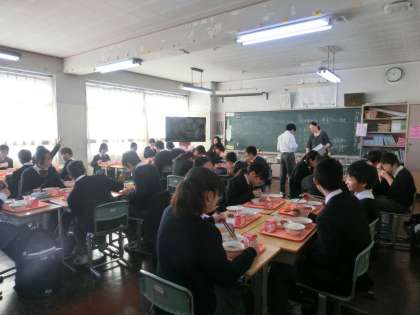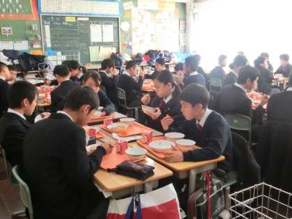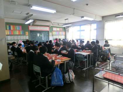 1年生も、2・3年生と同じに準備がきちんとできて良いですね。おかわりしている人は必ず大きくなります。ダイエットより、運動。中学生の新陳代謝力は凄まじく高く、適度な運動をしていれば、背は伸び、よい身体になります。
