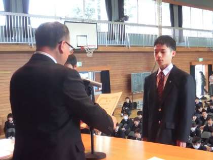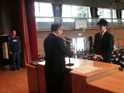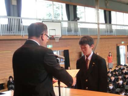 11月30日(月)生徒朝礼 俳句・水泳競技・中学生の作文コンクール入賞の表彰がありました。おめでとう!