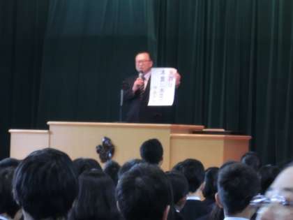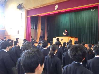 11月30日(月)生徒朝礼 俳句・水泳競技・中学生の作文コンクール入賞の表彰がありました。おめでとう!