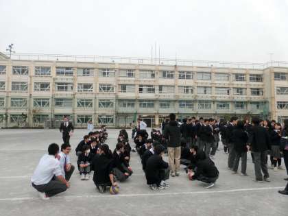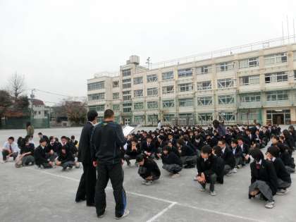 特に、すごかったのは校庭の3年生。声掛けをし合い、全員を校庭の中心に集め、避難。校舎内の生徒も、昼休みにかかわらず、迅速な避難ができました。完璧!驚き!素晴らしい!(防災指導は、生活指導部の羽根田先生)