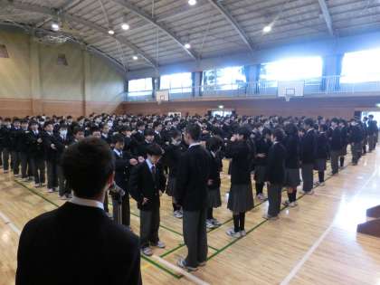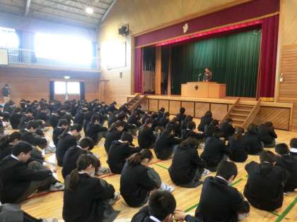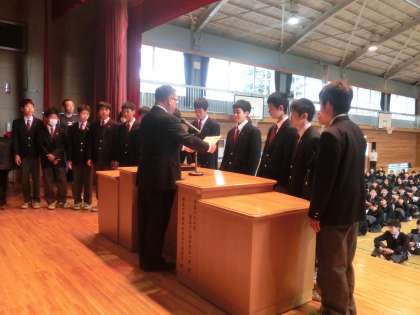 12月14日(月)朝礼 バスケットボール部1年生大会男女入賞!ソフトテニス部男女入賞表彰!おめでとう!