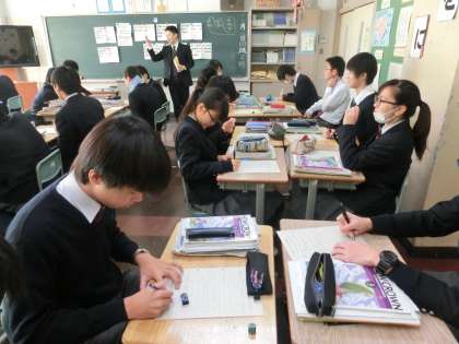 3年生徒の集中力が凄い!次々と難題にチャレンジ!教師の英語と生徒の英語が飛び交う授業でした。日本語はほとんどない。英語検定も次々とクリアしていく驚異の3年生の力をみました。※東京教師道場は、東京都教育委員会の全都のスーパー教師集団の研究会組織。指導は、英語科烏谷先生。