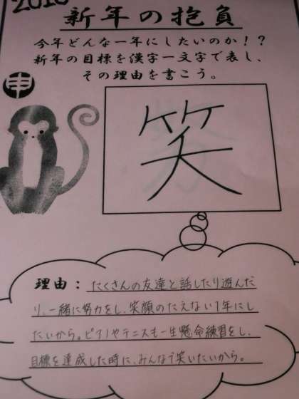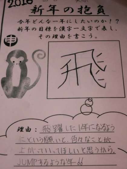 宿題チェックも同時に実施しています。新しく入ったモバイルパソコンを使って、インターネットも検索ソフトをよく活用して校外学習(都内巡り)を研究しています。冬休み明けですが、フルタイムで頑張っています。今年の「私の漢字」も示していますね。