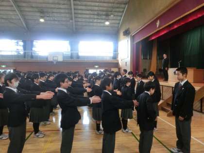 2学期制のため、始業式ではありませんが、冬休み明けの節目の日です。大変集中していて、立派な態度でした。いつも模範の3年生、1年生もしっかりと話を聞いています。今年も素晴らしい飛鳥中の良い年になると思います。期待の朝でした。