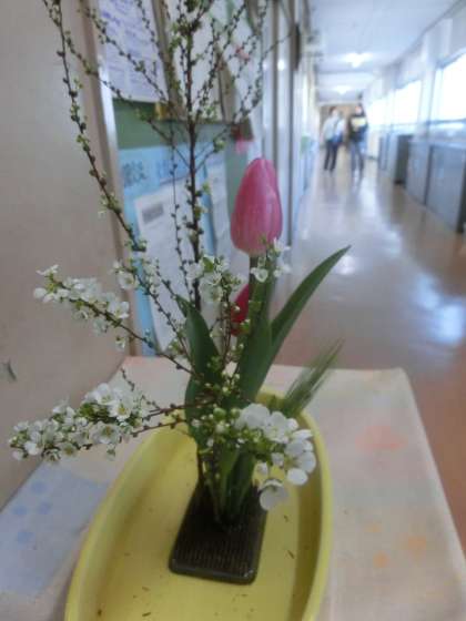 生け花は春を告げています。今日は都内私立高校推薦入試の願書出願日。