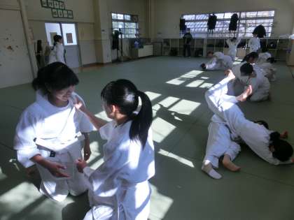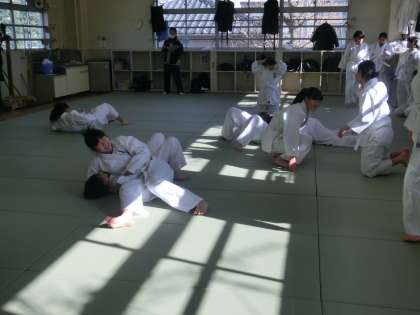 ※いろいろと工夫しながら、技をかけたり、受け身をしたりしています。指導は高橋先生。
