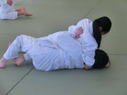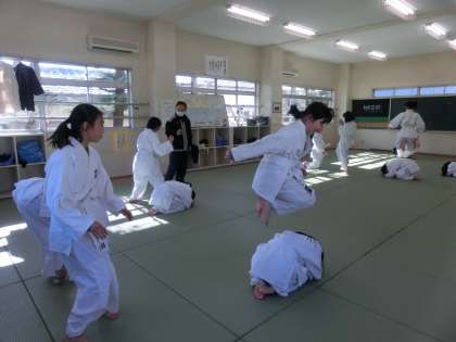 ※いろいろと工夫しながら、技をかけたり、受け身をしたりしています。指導は高橋先生。
