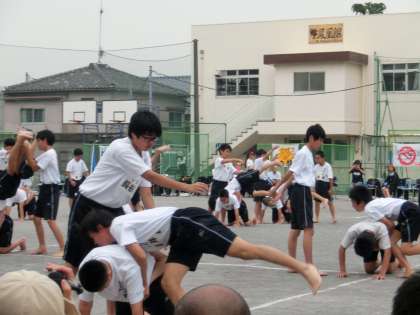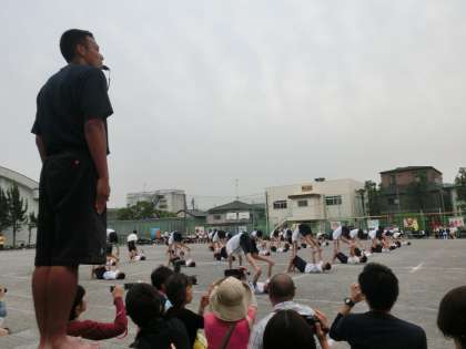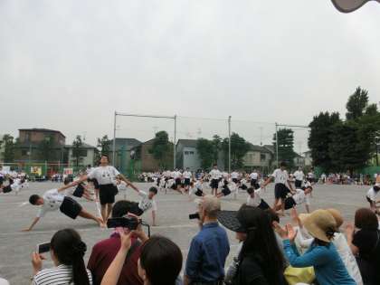 5月28日(土)飛鳥中運動会 午後の部 男子は組体操とピラミッドのかわりに集団行動を披露。整然とまた愉快な演技に拍手喝さいでした!
